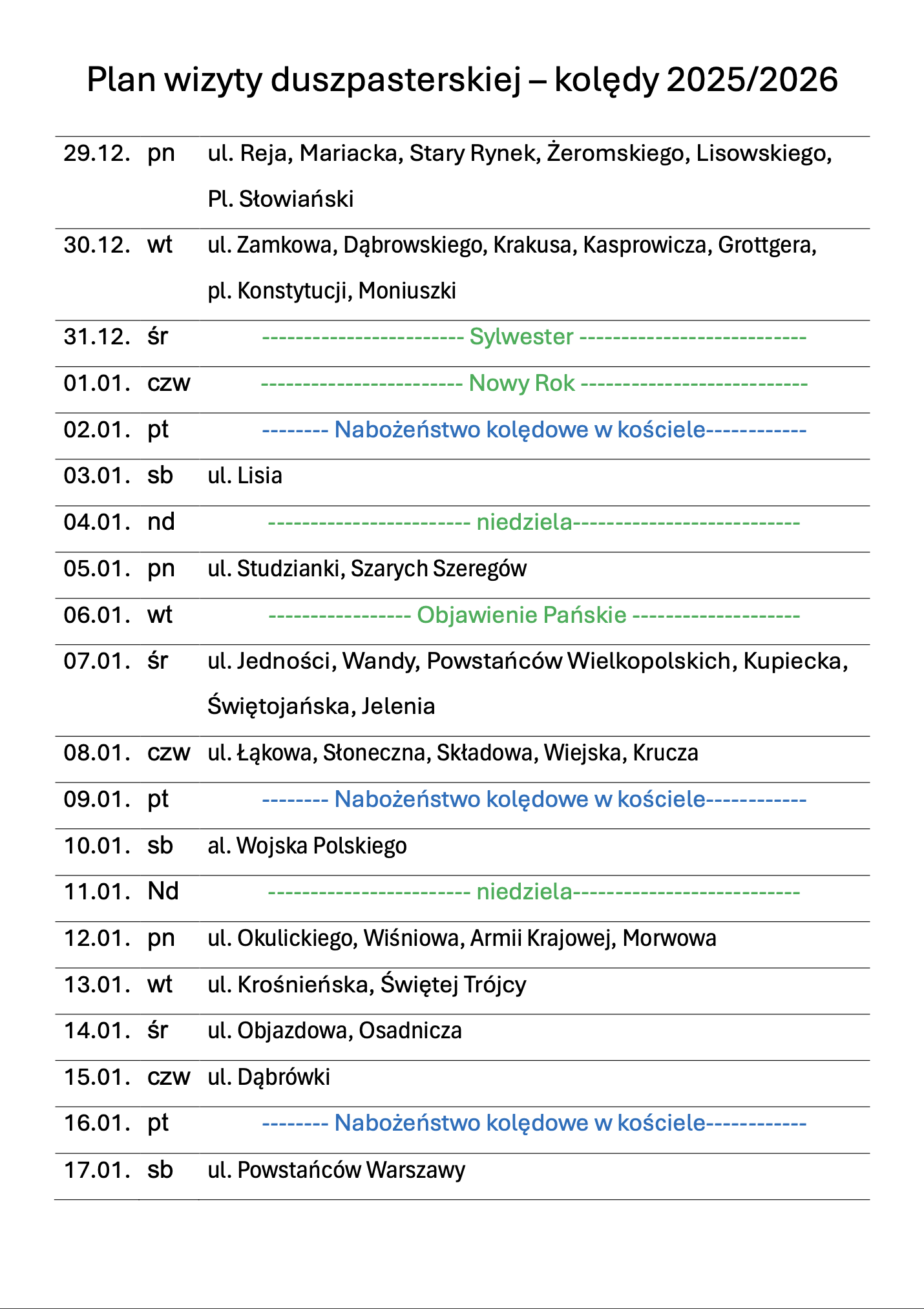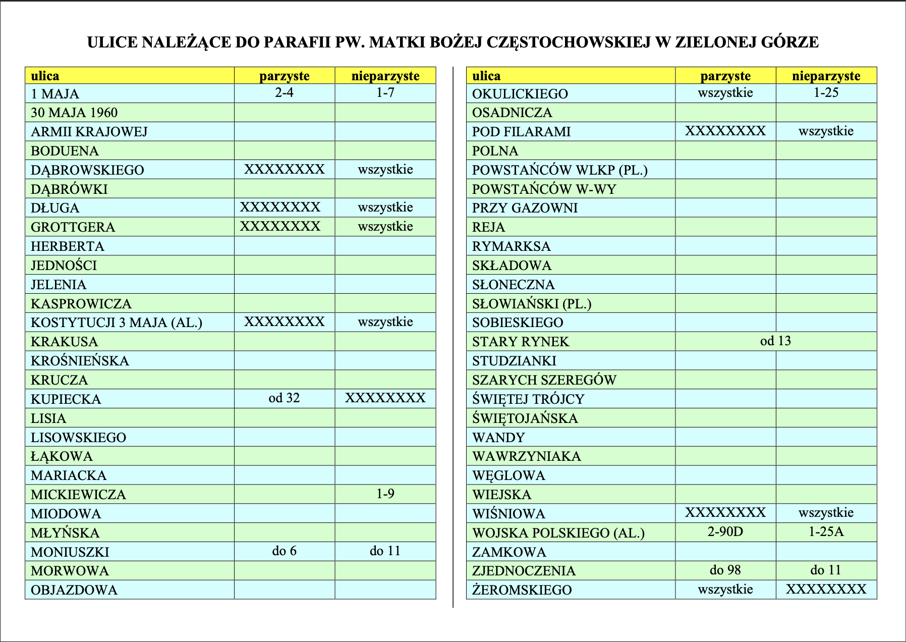 Poniżej planu znajduje się lista ulic należących do naszej parafii. Jeśli tam nie ma Państwa adresu, prawdopodobnie przynależy on do innej parafii - proszę się wtedy spodziewać innego Księdza